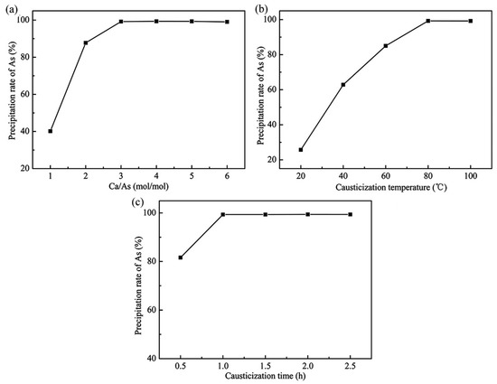 Time is another important factor affecting the chemical reaction, and a suitable time can ensure the high precipitation rate and efficiency. The effect of causticization time on the precipitation rate of arsenic was investigated under the following conditions: Ca/As of 4.0, temperature of 80 °C. The results in Figure 8c illustrate the effect of time in the range from 0.5 h to 2.5 h on the causticization process. At the initial reaction time from 0.5 h to 1.0 h, the precipitation rate of arsenic increased from 81.6% to 99.3%. A further increase in causticization time had almost no effect on the precipitation rate of arsenic. All further experiments were therefore performed for 2.0 h.
