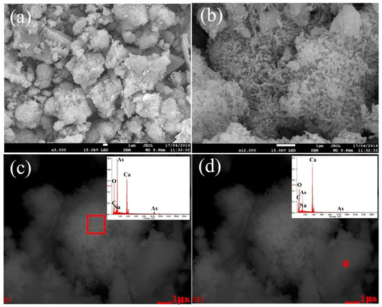 According to the results of the condition experiments, the optimized conditions of the causticization process were established as: CaO dosage of 4.0, temperature of 80 °C, time of 2.0 h. Under the optimized experimental conditions, the best precipitation rate of arsenic was 99.4%. The filtrate after causticization could be returned to the APOL process to realize the recycling of alkali. The chemical composition and XRD analysis of the precipitate are shown in Table 6 and Figure 9. The SEM images of the precipitate and the chemical compositions determined by EDS are presented in Figure 10. As can be seen from Table 6, the main components of the precipitate were 15.1% arsenic and 34.4% calcium. The results analyzed by XRD and the EDS patterns with the corresponding areas in Figure 10c,d indicate that the main phases in the precipitate were Ca5(AsO4)3(OH) and Ca(OH)2, in which Ca5(AsO4)3(OH) was the most stable form of calcium arsenate compound. An excessive dosage of CaO can increase the removal rate of arsenic, but inevitably leads to a reduction of Ca5(AsO4)3(OH) purity [37]. However, the reduction in the purity of Ca5(AsO4)3(OH) does not affect the subsequent reduction experiments for producing metallic arsenic, because Ca(OH)2 readily decomposes into CaO at a high temperature. The analytical results confirmed that the precipitation of arsenic was achieved by causticization process. The final product of calcium arsenate could be used to produce metallic arsenic by reduction.