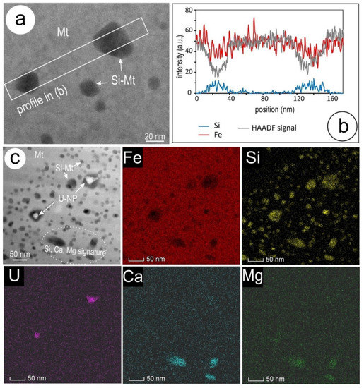 (a) HAADF STEM image and EDS-STEM profile (b) showing a field of Si-bearing nanoparticles (tens of nm; Si–Mt) in coarse magnetite (Mt) (foil #1, FIB cut shown in Figure 2a). (c) Image and EDS-STEM element maps showing a field with denser inclusions in the same foil. Note that the dominant inclusions are Si-bearing (Si–Mt), whereas a minority are either U-bearing NPs or Si–Ca–Mg bearing (bright and dark on HAADF STEM image, respectively). The latter define a Si–Ca–Mg signature part of the nanoprecipitates attributable to silician magnetite.