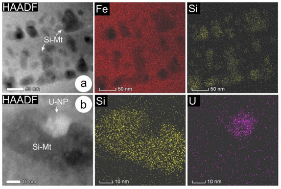 Higher-resolution HAADF STEM images (left) and EDS maps showing a field of Si-bearing nanoparticles (Si-Mt) along the crystal zoning in (a) and U-nanoparticles (U-NP) along trails crosscutting zoning in (b). Note U-NP is embedded within the Si-Mt nanoprecipitate.