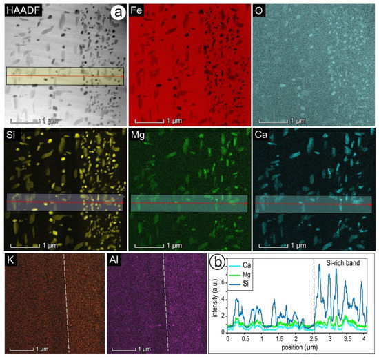(a) HAADF STEM (left side) image and STEM-EDS maps showing the presence of inclusions within magnetite (location #4, E transect; foil #5). Note variation in size and shape of inclusions with element concentration, whereby the smallest, bleb-like are highest in Si and Mg-, Ca-bearing ones are fine- to coarser acicular inclusions (calc-silicates). In contrast Al and K show banding, with slightly higher concentration overlapping with the band with densest inclusions. (b) Profile across particles in (a) showing sharp variation in Si signal across the contact between the bands with variable size/density inclusions. There is however, no to little variation in the Ca and Mg signals corelating with the fact that many of the Si-high blebs are SiO2 (quartz?).