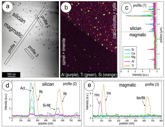 The two types of patterns attributable to overprinting of magmatic magnetite by silician magnetite are distinct in terms of type of inclusions, i.e., Al-bearing spinel (hercynite) + ilmenite and calc-silicates + rutile, respectively (Figure 9a,b). As shown above for all other examples of magnetite, there is a sub-population of Si-Fe-nanoprecipitate inclusions, generally the smallest, no more than a few nm in width. Some of these can be Al- and K-bearing (Supplementary Materials Figure S3). The boundary between the two domains is also marked by a relative increase in Si as shown on the profile in Figure 9c. The population of Ti-bearing inclusions increases in such cases relative to silician magnetite elsewhere. The association between different types of inclusions in each domain is exemplified by profiles across such assemblages (Figure 9d,e). In the silician magnetite domain there is a clear separation between the three types of inclusions, rutile, calc-silicates, and Si-Fe-nanoprecipitates. In the magmatic domain of the grain, assemblages of hercynite + ilmenite or ilmenite + rutile represent the main association.