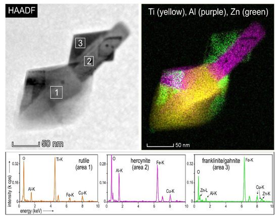 In general, inclusions from the magmatic domain are smaller than those in the silician magnetite domain. Nonetheless, coarser inclusions, tens of nm in size, also occur along trails of limited length (Supplementary Materials Figure S1). In this case, 3-component assemblages comprising rutile/ilmenite (?), hercynite (FeAl2O4) and a Zn-Al-Fe-bearing-phase were found (Figure 10). It is interesting to note the conspicuous Zn-signature in the magmatic domain, which contains a spinel with composition between franklinite (ZnFe2O4) and gahnite (ZnAl2O4) as inferred from the spectrum (Figure 10). The spectrum obtained for the Ti-rich species indicates the presence of Fe, inferring that rutile may have formed from pre-existing ilmenite.