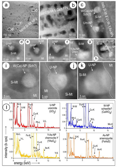 HAADF STEM images (a–k) and STEM-EDS spectra (l) showing U-, W-, Y-As-, As-NPs associated with Si-Fe-nanoprecipitates ± carbonates (foils #1 and #2). Note the finest NPs, mostly U-bearing (uraninite), occur along the crystal zoning in the coarser magnetite (a; d–f; foil #1) whereas the more diverse NPs occur along cross-cutting trails in the medium sized grains of magnetite (c; g–k; foil #2). In all cases the NPs are embedded within Si-Fe-nanoprecipitates (Si–Mt). Apy-arsenopyrite; Chern-chernovite; Sch-scheelite; Urn-uraninite. The Cu signal is from the TEM grid.