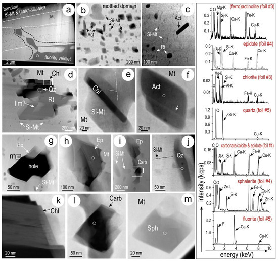 A diverse range of mineral inclusions were identified throughout the banding and from mottled domains in magnetite from all other locations along the E transect (Figure 14). In such cases, replacement of magnetite by secondary minerals (e.g., vein fluorite; Figure 14a) is also observed. Calc-silicates, represented by (ferro)actinolite, in some cases also associated with precursor calcic clinopyroxene (diopside-hedenbergite series) and epidote (Deep Mineralization) are prevalent. In contrast to the northern location #1, these calc-silicates are generally coarser and can form acicular inclusions throughout the mottled areas or occur crosscutting and oblique to fine rods of Si-Fe-nanoprecipitates nanoprecipitates (Figure 14b,c). Rutile is the second most abundant mineral and can occur as stubby grains interspersed with calc-silicates (Figure 14c) or tied to micron-sized clots with a diverse mineralogy including zircon, ilmenite (?) and secondary chlorite (Distal Satellite; Figure 14d). Calcite rods are found in association with Si-Fe-nanoprecipitates (Figure 14e). Coarser, euhedral grains of actinolite show compositional variation on HAADF STEM images (Figure 14f). Epidote is present on the margins of some of the largest voids, or forms part of elongate multi-component clusters including other minerals (Figure 14h,i). Quartz is particularly abundant throughout the magnetite with two sets of Si-Fe-nanoprecipitates (foil #5; Figure 14j). Typical morphologies for the identified inclusions include lamellar stacks of chlorite, euhedral, rhombohedral carbonates and rare sphalerite (Figure 14k–m). Representative spectra for these minerals are shown in Figure 13 and Figure 14.