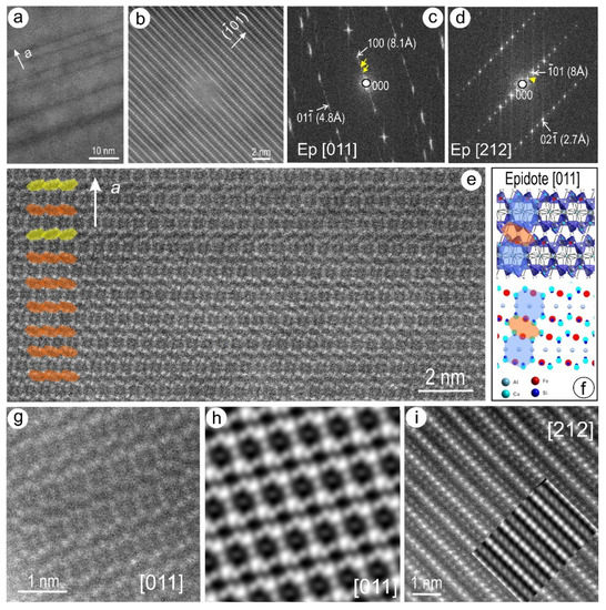 HAADF STEM (a,b) images and FFTs (c,d) showing epidote (Ep) on [011] and [212] zone axes (inclusion in Figure 14h; foil #4). Note correlation between irregular bands on (a), satellite reflections (arrowed) and streaks along a* indicating stacking disorder. (c) High-resolution image showing the main crystal structural motifs on [011] epidote. (f) Crystal structure models of epidote as polyhedral (up) and atom filling (down) on [011} zone axis. Note correspondence between ring structure and main motifs on (e). The smaller modules linking the rings are irregularly flipped (yellow and red overlays), indicating disorder on a. (g,h) Image and STEM simulation of epidote on [011]. (i) Image and STEM simulation (inset) of epidote on [212] zone axis.
