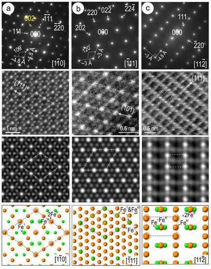 The atom distribution on HAADF STEM images for the , and zone axes in magnetite were assessed by STEM simulation and crystal structure models after calculating the zone axis from SAEDs (Figure 18). Such patterns are reproduced in the STEM simulations with good fit on all three zone axes.