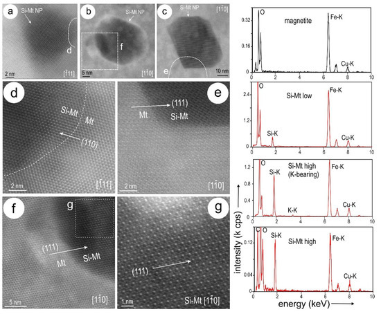 HAADF STEM images (a–g) and EDS STEM spectra (to the right) representing Si–Fe-nanoprecipitates with bleb morphology. (a–c) Variable morphology of bleb precipitates from smallest, rounded NPs in (a) to sub-rounded and short-prismatic in (b,c). (d–f) Details of boundaries between the precipitate and host magnetite (from areas as highlighted in (a)) on zone axes as marked showing epitaxial relationships between the two phases. (g) High-resolution image of the bleb precipitate (from area marked in f) showing the same atomic arrangement as magnetite on zone axis. Note magnetite outside the blebs is Si-free and the variation between Si/Fe ratio from low to high) in spectra to the right. The Cu signal on the spectra is from the TEM grids.