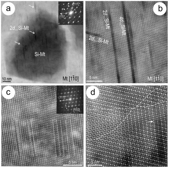 HAADF STEM images showing the two types of Si–Fe-nanoprecipitates (foil #5) on zone axis in magnetite (Mt). (a) Overlap between Si–Fe-nanoprecipitates as narrow strips (2d111 Si–Mt) and blebs (Si–Mt). Satellite reflections on FFT (arrowed, inset) are concordant with interpretation of maghemite superstructure [21]. (b) Strip nanoprecipitates occur along conjugate d111 and directions in magnetite with 2n (n = 1,2,...) widths. (c,d) Nano-twins and -misorientation domains (dashed line) in the bleb precipitates containing the 2n.d111 strips.