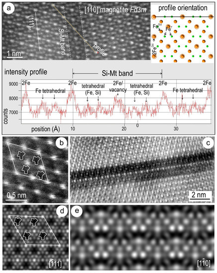 Although it is difficult to unequivocally discriminate between magnetite and the Si-Fe-nanoprecipitate structure on the image where they overlap, intensity line profiles show variation attributable to Si substitution in the tetrahedral site and vacancies in the octahedral site in accordance with the crystal structural formula [□0.5Fe2+0.5]VI[Fe3+]VISiIVO4 for γ-Fe1.5SiO4 [29] (Figure 21a). Comparison between images (Figure 21b,c) and STEM simulations (Figure 21d,e) for γ-Fe1.5SiO4 show a relatively good fit on zone axis. The decrease in intensity across the Si-Fe-nanoprecipitate strip is somewhat reproduced in the model layering for the zone axis. The fit for the Si-Fe-nanoprecipitate images implies that some blebs may be also nanoprecipitates with the same vacancy-ordered structure as considered for the d111 strips.
