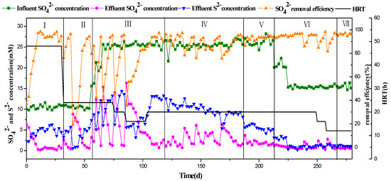 The first stage was the start-up stage of biofilm formation. Many researchers have found that the process of biofilm formation on filler surface could be frequently affected by the environmental and operational conditions, such as carbon and nutrients availability, fluid velocity, MLSS, temperature, pH and surface roughness [22]. It has been proved that the formation of biofilms is very slow at the initial stage in the removal of pollutants in MBBR [23]. Their results showed that the planktonic cells first adhered to the filler loosely, then the cells gathered and grew on the surface of the filler to form a biofilm and the biofilm formation rate increased with the decrease of HRT. In the first stage, the HRT was 48 h. The concentration of sulfate in the influent was 10 mM and 2 mM nitrate was used instead of Fe(II)EDTA-NO. The agitator and aerator were closed to ensure the film-forming of sulfate reducing bacteria and denitrifying bacteria on the filler surface. After 20 days of reactor operation, the removal efficiency of sulfate could reach more than 95% (Figure 1) and the colonization of sulfate reducing bacteria was successful. The film-forming on the filler was unsatisfactory and a lot of activated sludge was suspended in the reactor. After 10 days of continuous culture, a layer of biofilm was observed on the inner surface of the filler which was black with a thickness of about 0.5 mm. The amount of suspended sludge was very small in the reactor. Combined with the reduction of suspended sludge in the solution and the formation of biofilm on the filler surface, it was proved that biofilm formation was successful. At this time, the removal rates of sulphate and nitrate remained at the previous high levels. In the subsequent reactor operation, the reactor HRT was reduced and the influent load was increased to improve the reactor treatment load. No thiosulfate had been detected in the effluent from the reactor start-up. In this stage, the average sulfide concentration in effluent was 5.42 mM and 53.7% of the sulfate reduction products were sulfides. The sulfur autotrophic denitrification reaction with sulfide as the electron donor and nitrate as the electron acceptor is shown in Equation (5) [24]. More specifically, 2 mM nitrate can convert up to 5 mM sulfide into elemental sulfur. Therefore, sulfide existed in the effluent of the reactor when the sulfate was almost completely degraded.