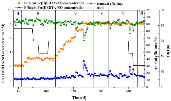 After determining the influent concentration of sulfate, HRT was reduced to increase the treatment loads of sulfate and Fe(II)EDTA-NO. Because the influent sulfate concentration was radically high, HRT was reduced by four hours each time. When HRT was reduced from 24 h to 20 h, the removal efficiency of sulfate and Fe(II)EDTA-NO could reach more than 90% (Figure 2). However, when the HRT was reduced to 16 h, the removal efficiency of sulfate radical decreased significantly and the maximum was only 83%. After HRT was restored to 20 h, the sulfate removal efficiency was still 95% and the reactor performance was restored. So, the HRT was maintained at 20 h. After about 120 days of operation of the reactor, the removal load of sulfate was 2.88 kg SO42−·m−3·d−1. Cunha et al. used an UASB reactor to treat acid mine drainage and the maximum sulfate loading rate was 2.6 g SO42−·L−1·d−1 [29]. It could be seen that the sulfate treatment load and removal efficiency of this experiment had reached a high level. The removal rate of Fe(II)EDTA-NO was relatively stable in the process of reducing HRT, which proved that the load of Fe(II)EDTA-NO can continue to increase.