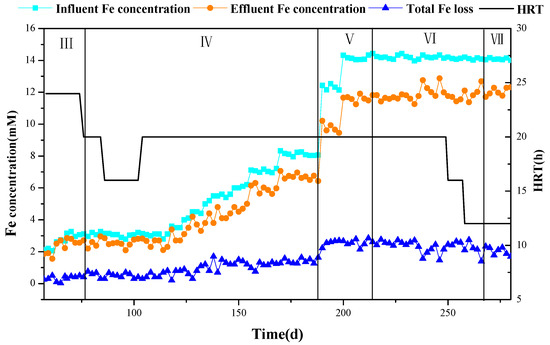 After adding Fe(III)EDTA in the fifth stage, the total loss of Fe increased by about 1.5 mM. By acid dissolution of the precipitate in the effluent, Fe(II) and Fe(III) were found in the precipitate and the content of Fe(III) was less. It was proved that the precipitate was mainly FeS with a small amount of ferric hydroxide precipitate [26,27,39]. According to the analysis of sulfide concentration change at this stage, it is inferred that the main process is the oxidation–reduction reaction between Fe(III) and sulfide to form Fe(II) and elemental sulfur, accompanied by the formation of a small amount of FeS precipitation. In the sixth stage, the total iron loss did not change significantly with the change of sulfate concentration and HRT.