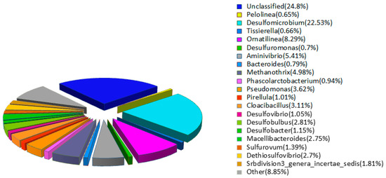 Five sulfate reducing bacteria, Desulfomicrobium, Desulfomonas, Desulfovibrio, Desulfobulbus and Desulfobacter, were found in the third stage. Abundance reached 22.53%, 0.7%, 1.05%, 2.81% and 1.15%, respectively (Figure 4). These five bacteria can use organic carbon sources such as sodium lactate to reduce sulfate [48,49,50,51] and the dominant strain was Desulfomicrobium. A sulfur autotrophic denitrifying bacteria Sulfurovum was also found in the system, accounting for 1.39%. Sulfurovum can simultaneously oxidize sulfides and reduce nitrates in a chemoautotrophic manner [52,53]. The presence of this bacteria may have played a role in the simultaneous removal of Fe(II)EDTA-NO and sulfide in the reaction system which would produce S0 and regenerated Fe(II)EDTA. Pseudomonas also existed in the reactor, accounting for 3.62%. Pseudomonas is a facultative anaerobic bacteria. It has been proved that Pseudomonas can reduce Fe(II)EDTA-NO with glucose as a carbon source in the BioDeNOx system [54]. Pseudomonas has also been found to use Fe(II)EDTA-NO and sulfide for sulfur autotrophic denitrification and the proportion could reach up to 35.7% [9]. Fermentation acidogenic bacteria Ornatilinea and Cloacibacillus were also found in the reactor. There were also Aminivibrio strains related to amino acid metabolism. Methanothrix can decompose acetic acid with sulfide as a sulfur source to produce CH4 and CO2 [55]. Tissierella can metabolize protein, yeast extract and glucose and produce hexanoic acid, propionic acid, isohydric acid, T acid, isovaleric acid and other low molecular organic acids (or volatile fatty acids) [56].