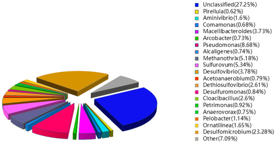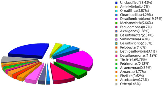 In the sixth stage, the dominant bacteria were Desulfomicrobium (19.76%) and Pseudomonas (8.7%). Several other sulfate reducing bacteria, including Desulfomonas, Desulfovibrio and Desulfobacter, accounted for 6.22% of the total (Figure 6). The proportion of Pseudomonas slightly increased compared with the fourth stage. It may be that the addition of Fe(II)EDTA-NO load promotes the growth of Pseudomonas. Sulfurovum accounted for 4.49 % of the total which slightly decreased compared with the fourth stage. At the same time, a heterotrophic desulfurization and nitrogen fixing bacteria Azoarcus (1.77%) was found, which can oxidize sulfide to sulfur in a weak alkaline environment [59].