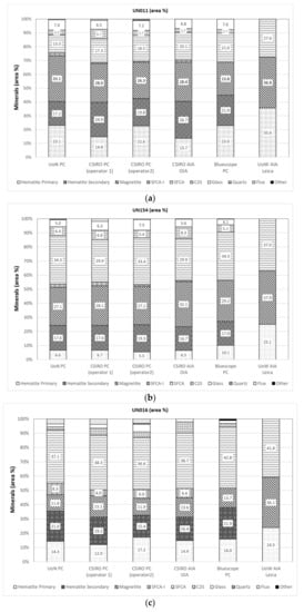 Agreement between the different laboratories is generally acceptable, although higher differences occur for UN011 sample (see Table 2). The variability in SFCA, primary hematite, secondary hematite and magnetite for UN011 were all higher than 12%. The variability in SFCA, magnetite and total hematite concentration for UN154 and UN016 samples was no more than 11%. Significant variability was found in the SFCA-I concentration for all three samples, but the variation decreased as the amount of this phase increased in the sample.