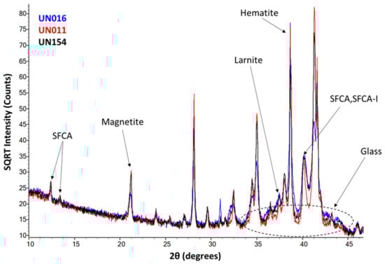 Overlay of XRD patterns (λ = 1.789 Å) collected for the UN011, UN154 and UN016 samples. Peaks from major phases—hematite, magnetite, SFCA, SFCA-I, larnite (C2S) and glass—are labelled. The dashed oval highlights the broad hump between ≈ 33 and 45° 2θ from the amorphous material (glass). SQRT—square root.