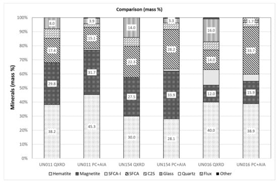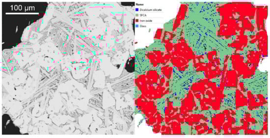 Many authors have reported a difference in the chemical composition of SFCA and SFCA-I [,,,,]. Compared to SFCA, SFCA-I has a relatively high Fe and low Si composition and has a lower temperature stability range. Tonzetic and Dippenaar [] used Quantitative Evaluation of Materials by Scanning Electron Microscopy (QEMSCAN) analysis to exploit this difference in chemistry and were able to delineate SFCA-I from SFCA. In their study, SFCA-I was measured as calcium ferrite, as it had levels of silicon and aluminium that were below the detection limit of the QEMSCAN. For SFCA, it was found that a silico-ferrite of calcium (SFC) existed and dominated the SFCA phases and that Mg analogues of SFCA, “aluminates” (SFCAs without iron), silico-ferrites of Na and K and pure silico-ferrites (of a stoichiometry different from pyroxenes or olivines) also existed. Compared with PC and QXRD, significant differences in results were found; for example, QEMSCAN and QXRD reported more SFCA-I than PC, and QEMSCAN reported more hematite than either PC or QXRD.