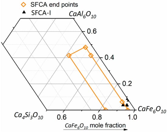 Given the difficulty in reconciling all mineral phases in the sinter sample by PC and QXRD, in particular the different textural types of SFCA, two different SEM-based approaches were used to examine a number of the key morphologies present. SFCA has been found to be stable on the CaO∙3Fe2O3-CaO∙3Al2O3-4CaO∙3SiO2 (CF3-CA3-C4S3) plane [,,]. Murao et al. [] determined thermodynamic stability for SFCA, and this range is reproduced in Figure 6. Less work has been reported for SFCA-I; however, many authors have reported a difference in the chemical composition of SFCA and SFCA-I [,,,]. Selected results are plotted in Figure 6 for comparison. Based on this, it is hypothesised that SFCA-I plots toward the CF3-CA3 axis.