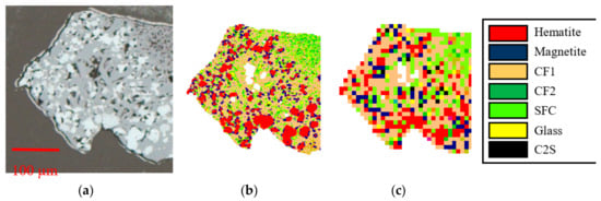 Comparison of (a) the optical photomicrograph and (b) the corresponding Quantitative Evaluation of Materials by Scanning Electron Microscopy (QEMSCAN) image at (b) 2 µm and (c) 10 µm pixel resolution, of a sinter particle colour-coded as hematite—red, magnetite—blue, prismatic SFCA (CF1)—tan, platy SFCA-I (CF2)—dark green, with SFC—light green, minor interstitial glass—yellow and C2S—black. N.B. Magnetite appears as a phase boundary artefact in this image; QEMSCAN discrimination of prismatic and platy SFCA types is approximate. N.B. Remnant carbon coating is visible at the interface between the particle edge and mounting resin in (a).