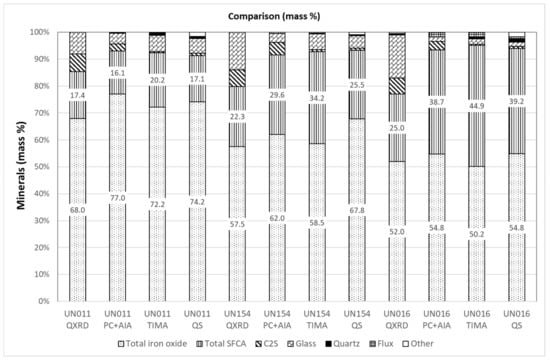 Results of QEMSCAN (marked as QS) and TIMA analysis (measurement: liberation analysis, scanning mode: resolution) are compared with XRD and PC data in Figure 9. Hematite and magnetite are combined as total iron oxide and SFCA-I and SFCA have been similarly combined. The total iron oxide concentration measured by TIMA agreed well with the total iron oxide measured by PC and QXRD with the difference less than 5%; the total SFCA amounts determined by TIMA were all relatively lower (the differences were no more than 6%) than the PC results, lending some weight to the hypothesis that some amorphous SFCA phases may exist in the sinter samples.