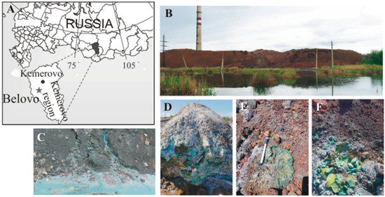 (A) Geographical location of the study object; (B) General overview of the Belovo waste heaps; (C) Drainage streams from inner parts of the heaps; (D–F) Secondary efflorescences on the surface.