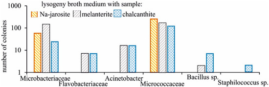 Bacterial strains were detected in all samples after seeding. The greatest diversity was characteristic for the medium with chalcanthite (Figure 3), in which the strains of six families were represented, the smallest for medium with Na-jarosite (only two families). However, in terms of the number of colonies, the medium obtained by adding chalcanthite was the least populated. The families, Microbacteriaceae and Micrococcaceae, were cultured only. A distinctive feature of the medium obtained with the addition of chalcanthite was the presence of the bacteria, Staphilocuccus sp.