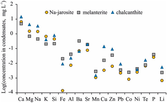The jarosite was the most stable mineral when heated, with melanterite being the least stable according to the results of the experiments. Melanterite is a mineral of ferrous Fe (Fe(II)), and the Fe concentration in the gas condensate was the highest at 45 °C (i.e., 21 μg/L) compared to the jarosite (0.14 μg/L). However, the content of the major cations (Ca, Mg, Na) and some metals (Sr, Cu, Zn, Pb) was markedly higher in the condensates separated from chalcanthite (Figure 4). The concentrations of Fe, Al, Ba, Mn, and P were higher in the condensates from the melanterite. The highest K concentrations were in the condensates from the Na-jarosite, due to the decay of misenite (K8H6(SO4)7).