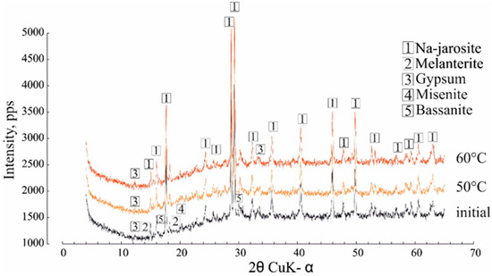 The phase transformation during heating showed that the Na-jarosite remained stable throughout the temperature range (Figure 5), although the composition of the impurity mineral, melanterite, changed this, decreasing the intensity of the diffraction peaks. Minerals of the jarosite group are common and, according to [28,29,30], can be formed under a variety of natural conditions at temperatures of 25 to 110 °C. Clearly, the water separating from the Na-jarosite involved water molecules that were adsorbed on the surface of a single crystal/grain (this corresponded to the lowest content of Fe and SO42− in the gas condensate).