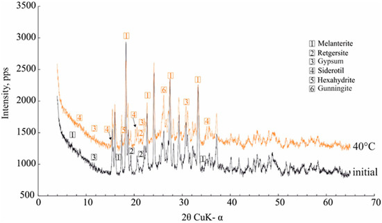 The investigation of sulfates and hydrated sulfate minerals plays a key role in the interpretation of the hydrochemical history of man-made toxic tailings (and rock dumps) [2,17,18,19,20,21]. An investigation of the phase dehydration mechanisms of sulfate–mineral mixtures is important in determining how mine waste interacts with the local environment, and in understanding the processes by which mine waste matures with time and reacts to changes in temperature and/or humidity [22,23]. The temperature of water separation from sulfate-mineral mixtures (nonetheless, predominantly monomineral) and their transformation were studied here. Latent acidity is effectively stored in these secondary sulfate minerals, and could be underestimated when monitoring the local environment during dry summer testing (1):