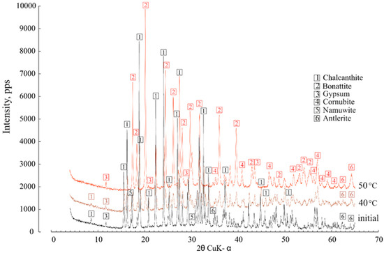 The dehydration of 5H2O-chalcanthite began at 40 °C, when the first lines of trihydrate (CuSO4∙3H2O) bonattite appeared; the chalcanthite completely lost 2H2O molecules and transformed to bonattite at 50 °C (Figure 7). None of the transformations were as vividly manifested in the XRD patterns. The gypsum remained unchanged. At first glance, it was observed that the powder diffractogram of the predominant chalcanthite was the most complex, with six accurately identified minerals. This is why the major content of the cations and metals (Sr, Cu, Zn, Pb) was markedly higher in the condensates separated from chalcanthite.