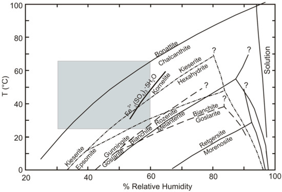 Sulfate salts are abundant in deposits and mining environments [1,2,3,4,5,6,7,8,9]. Their numbers extend well beyond the simple sulfate salts that have thus far been investigated experimentally, as described in [17]. Most experimental studies have been limited to simple salts with metals in a single valence state, combined with sulfate and various numbers of water molecules. Examples include the Fe2+SO4–H2O, Cu2+SO4–H2O, and MgSO4–H2O systems [31], and ZnSO4–H2O [32]. Sulfate minerals are important minor constituents of high-temperature hydrothermal systems and waste heaps, such as the burning Belovo waste. Simple metal-sulfate salts are rare in high-temperature technogenic settings due to the complexity of pyrometallurgical enrichment material [14,25]. Nevertheless, a comparison with stoichiometric minerals forms a basis for discussion. The diagram from [17], showing the location of dehydration reactions in simple sulfate systems is presented in Figure 8. The minerals that were not found in our study are listed in Table S1 for convenience. The gray field marks the range of temperature/humidity conditions for the laboratory experiments in this article (25–60 °C), according to [33]. Jarosite is not shown because we considered only simple reactions, where the only chemical difference among the minerals was the number of hydration water molecules in the mineral formula; for example, melanterite-rozenite (2):