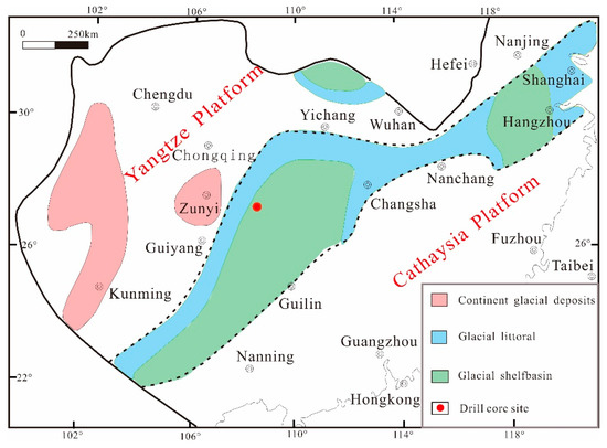 Paleogeographic map of the Nantuo Formation in South China (Modified after reference [27]). The red dot shows the locality of the drill core investigated in this study.