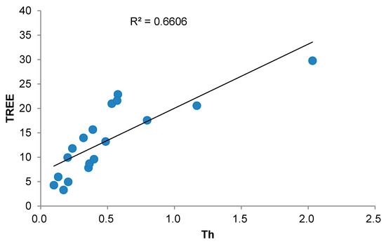 Positive correlation between the Th concentration and total REE concentration (TREE representing total REE concentration).