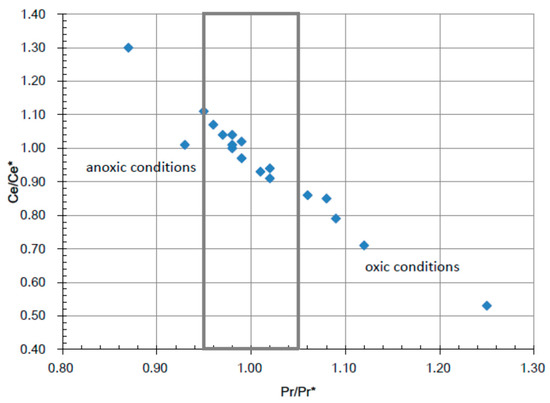 It should be noted that anomalies are calculated on a linear scale in the majority of the literature, with Ce/Ce* and Pr/Pr*, for example, expressed as follows [21,31]: