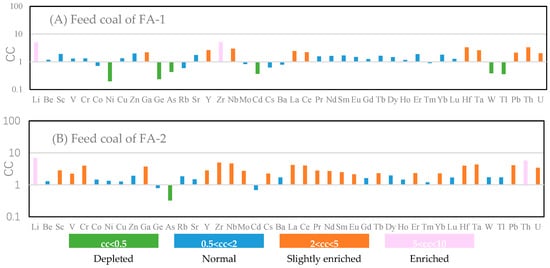 Concentration coefficients (CC) for trace elements in the feed coals for FA-1 and FA-2, normalized to average trace-element concentrations in world hard coals from Ketris and Yudovich, 2009 [47].