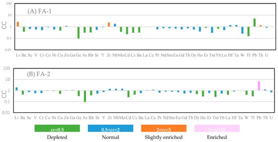 Concentration coefficients (CC) for trace elements in FA-1 and FA-2, normalized to average trace-element concentrations in world hard coal ashes from Ketris and Yudovich, 2009 [47].