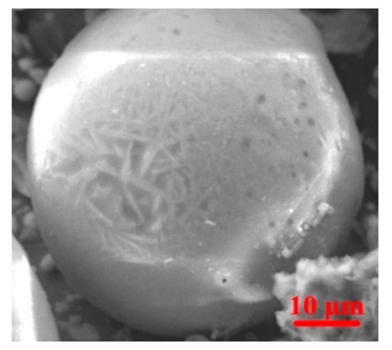 FA-1 is a pulverized coal–fired fly ash. In this type of boiler, powdered coal was sprayed into the boiler [48,49,50] and was burned at temperatures above 1200 °C. The XRD pattern for this fly ash has an amorphous hump between 15° and 30° 2θ and also contains crystalline quartz (SiO2) and mullite (Al6Si2O13) (Figure 3a). During coal combustion in power plants, mullite is typically found in fly ashes formed using this process. The high content of mullite in FA-1 (Figure 3a) is related to the kaolinite in the feed coal (Figure 3b), which is consistent with results reported in the literature [12,51]. Needle-like mullite crystals on glass spheres (Figure 4) indicate that the mullite crystallized from the amorphous aluminosilicate melt during the combustion but did not transform directly from kaolinite [12]. The various spherical shapes of many fly ash particles suggest that they were solidified from a viscous fluid state [52].