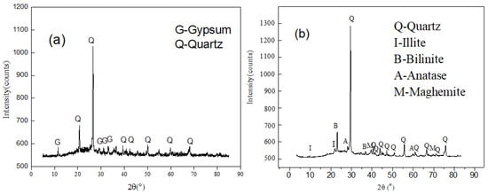 FA-2 is a circulating fluidized bed fly ash. The circulating fluidized bed boiler can use washed coal, tail coal, and gangue. The feed coal for FA-2 contained illite, bilinite, anatase and maghemite (Figure 5b). In the fly ash sample for FA-2, the amorphous phase is dominant, but it also contained less quartz and gypsum (Figure 5a). Clay minerals, such as illite, did not melt to form mullite, which is related to the lower temperature of the boiler (800–850 °C) [48,49,50]. Quartz was the remaining phase from the feed coal, and gypsum formed in the desulfurization process through absorption and oxidation.