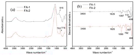 There are also some different vibration bands between the two samples (Figure 6a). FA-1 shows a shoulder peak at about 915 cm−1 associated with the presence of aluminum in the octahedral position, confirming the existence of mullite [59]. The doublet bands at 778 cm−1 and 792 cm−1 in FA-2 are associated with the symmetric stretching vibrations of the Si–O–Si bridges [31,44].