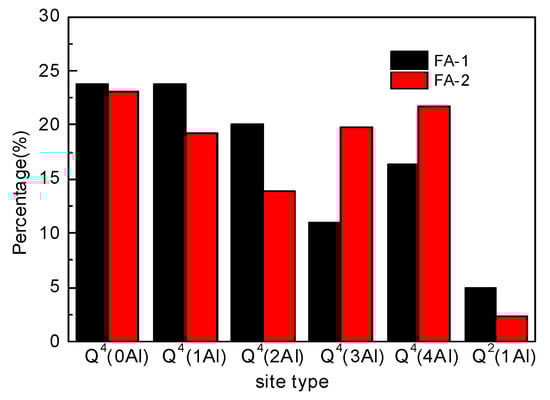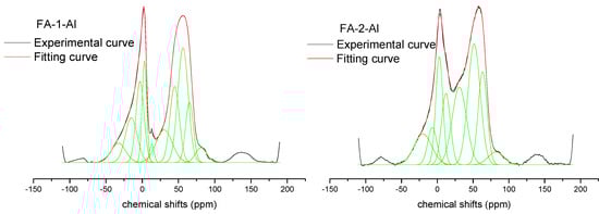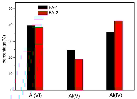 The 29Al MAS–NMR spectra for FA-1 and FA-2 are shown in Figure 9, and the results of the deconvolution are listed in Table 5 and are shown in Figure 10. As shown in Figure 9, the wide resonance range for FA-1 and FA-2 at –50 ppm to 100 ppm indicates a combination of Al(IV), Al(V), and Al(VI) instead of a single Al. This can be attributed to the structure of the glass and the amorphous phase present in both samples [32,70,72]. Under high temperature conditions, Al(IV) can undergo an isomorphous substitution with Si to form an aluminosilicate [73]. In terms of FA-1, a narrow octahedral Al peak is observed at around 2 ppm, and it has been reported that the resonance at this site is attributed to the Al components from mullite with a negligible reactivity [32]. Compared to FA-1, FA-2 has a higher content of tetrahedral Al (Figure 10). This tetrahedral Al and tetrahedral Si can combine with oxygen to form Qn(mAl); FA-2 has a higher Al content in Qn(mAl) than FA-1 due to the higher content of tetrahedral Al, consistent with the results of the 29Si MAS–NMR analysis.
