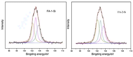 The Si 2p XPS spectra for FA-1 and FA-2 are shown in Figure 11. The fitting data are extracted from the spectra via peak fitting using XPS PEAK and are listed in Table 6. The increasing isomorphic substitution of Al3+ for Si4+ leads to a decrease in the binding energy due to the delocalization of the electrons over the silicate anion, as well as an increase in the negative charge and an increased shielding of the silicon nuclei [74]. The peak position of Si 2p at around 103 eV indicates the presence of SiO2. The main forms of Si in fly ash are non–bridging Si (Si–O) and bridging Si (Si–O2), with binding energies of (102.4 ± 0.3) eV and (103 ± 0.4) eV [75]. As shown in Table 6, the content of Si–O2 for FA-1 is 37.48% higher than Si–O (28.57%), while the content of Si–O2 is 30.21% lower than Si–O (40.15%) for FA-2 because more substitution of Al3+ for Si4+ leads to a decrease in the number of Si–O–Si linkages and the formation of Si–O–Al, which is consistent with the FTIR and 29MAS–NMR results. In addition to Si–O and Si–O2, there remains a peak at a high binding energy for FA-1 and FA-2. According to the standard binding energy spectrum, it was found that this peak can be assigned to SiO2 gel, which was also reported by Kanuchova [8,33].