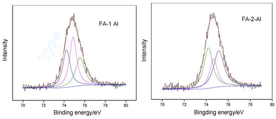 The Al 2p spectra clearly show that, as the Si content increases, the Al 2p binding energy also increases. This is because the ionic Al–O bonds increase as the tetrahedral Si content increases. As shown in Figure 12, the binding energy of three peaks for FA-1 are higher than for FA-2, which is due to the higher SiO2 content for FA-1 compared to FA-2 [76], as shown by the chemical analysis. XPS is also capable of differentiating between tetrahedral Al and octahedral Al. In general, the binding energy of octahedral Al is higher than tetrahedral Al, at 74.1–75.0 eV and 73.4–74.55 eV, respectively [76]. Octahedral Al is the dominant form for FA-1 with a content of 40.25% (Table 7), while the main form is tetrahedral Al for FA-2 with a proportion of 37.36%. In addition, both FA-1 and FA-2 have a peak with a binding energy exceeding 75 eV, which may be assigned to the native oxide of Al according to the standard energy spectrum, including pentahedral Al or octahedral Al in montmorillonite [76] or other oxides. The exact nature of this phase needs to be further investigated.