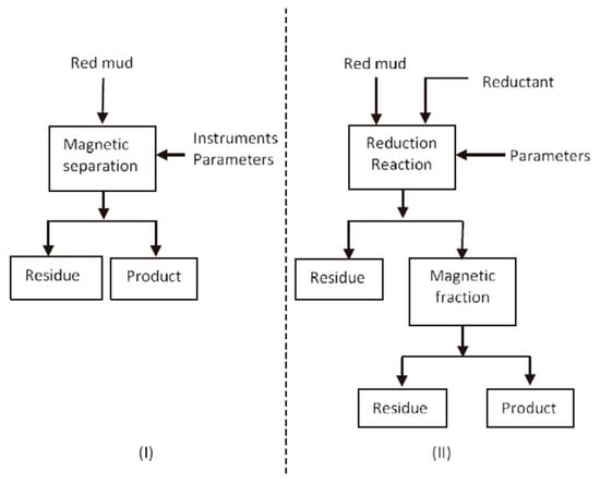 Simplified schemes for recovering iron from RM-direct magnetic separation (I) and magnetic separation after reduction roasting (II) []. Reproduced with permission from Liu et al., Waste Management; published by Elsevier, 2014 [].