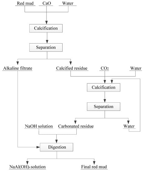 In recent years, some new technologies have been formed to treat RM, such as hydrothermal lime method, normal pressure lime method, lime–soda sintering method, and combined calcification–carbonization method []. These methods have achieved good results in controlling the alkalinity of RM in sintering process and combination method. Among which, combined calcification–carbonization method can regulate the alkaline and recover Al2O3 in RM. Zhang et al. proposed a novel combined calcification–carbonization method to recover aluminum and sodium from Bayer RM []. The novel process consists of two basic steps: calcification and carbonization (Figure 3). First, lime is added into the RM used to transform the main mineral phase Na2O∙Al2O3·xSiO2·(6 − 2x)H2O into hydrogarnet 3CaO·Al2O3·xSiO2·(6 − 2x)H2O and the Na2O dissolved in the solution. Then, the above calcified solid product was carbonized by high-pressure CO2, which decomposes it into calcium carbonate, calcium silicate, and aluminum hydroxide. Finally, under the low concentration of NaOH solution, aluminum hydroxide in the carbonized product can be easily extracted. The RM treated by this method can result in an alumina leaching rate of 46.5%, and the Na2O content in the leaching residue drops to 0.3% or less. These two steps turn RM into a nonhazardous and near-neutral residue that can be used for building material production.