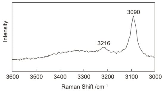 The Raman spectrum of H2O (Figure 1) shows prominent peaks at 3090 and 3216 cm−1, with weaker features at higher wavenumbers. Dubessy et al. [22] assigned these peaks to hexagonal ice (Ih); however, the Raman spectra of cubic ice (Ic) and Ih are identical [32,33]. The cubic ice (Ic) should be the stable phase at −180 °C at which the spectra were collected [34,35]. Although these interpretations of the Raman peaks are inconsistent with each other, there is agreement that these peaks correspond to O–H stretching vibrations in ice. These peaks are also present in all of the chloride solution spectra [22,32,33,34,35].