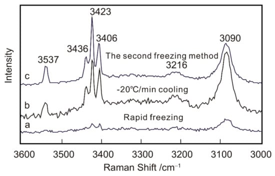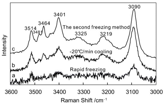 Figure 2. Raman spectra of a 15 wt.% NaCl solution cooled to −180 °C under conditions of (a) rapid freezing, (b) controlled cooling at a rate of −20 °C/min, and (c) secondary cooling.