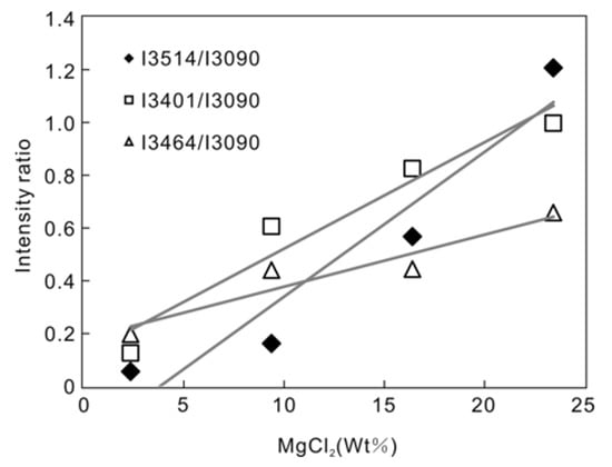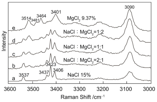 In Figure 13, the 3537 cm−1 peak is higher than the peak at 3514 cm−1 for the mixture where NaCl:MgCl2 = 2:1. The two peaks are almost equal in intensity for the NaCl:MgCl2 = 1:1 mixture, and the 3537 cm−1 peak is lower than the 3514 cm−1 peak for the mixture with NaCl:MgCl2 = 1:2. Thus, the relative intensity of peaks at 3537 and 3514 cm−1 reflects the relative amounts of NaCl and MgCl2.
