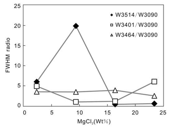Figure 9. Relationship between the FWHM ratio of MgCl2 hydrate and the 3090 cm−1 peak at different MgCl2 concentrations.