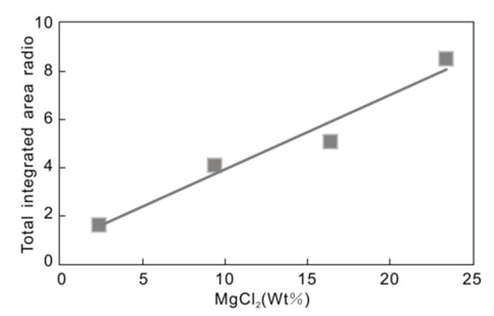 However, the FWHM, integrated area, and MgCl2 of concentration correlate poorly (Figure 9 and Figure 10). The ratio of the total integrated area of MgCl2 hydrate peaks combined with the area of the 3090 cm−1 peak shows the strongest correlation with its concentration (Figure 11), with Int(total)/Int(3090cm1) = 0.1451C + 0.8298, and R2 = 0.9588. The high correlation coefficient indicates that the concentration of salt can be obtained from the ratio of the total integrated area of MgCl2 hydrate and the 3090 cm−1 peak.